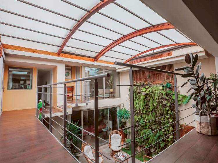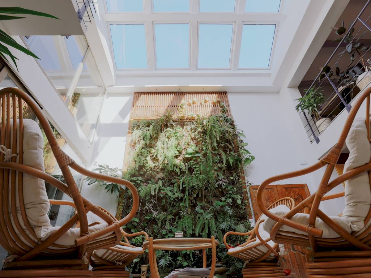 Une combinaison de fenêtres de toit qui permet une meilleure entrée de lumière en complément de cette verrière fixe.